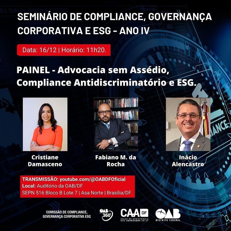 Na última sexta-feira, dia 17/03, o nosso sócio Inácio Bento Loyola Alencastro participou de evento realizado pela Comissão de Compliance, Governança Corporativa e ESG da OAB/DF, com objetivo