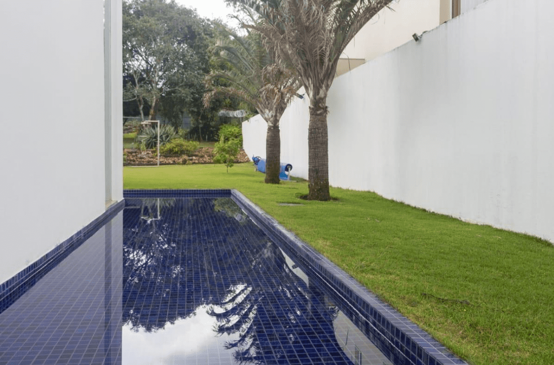 Piscina revestida em pastilhas com deck molhado;
