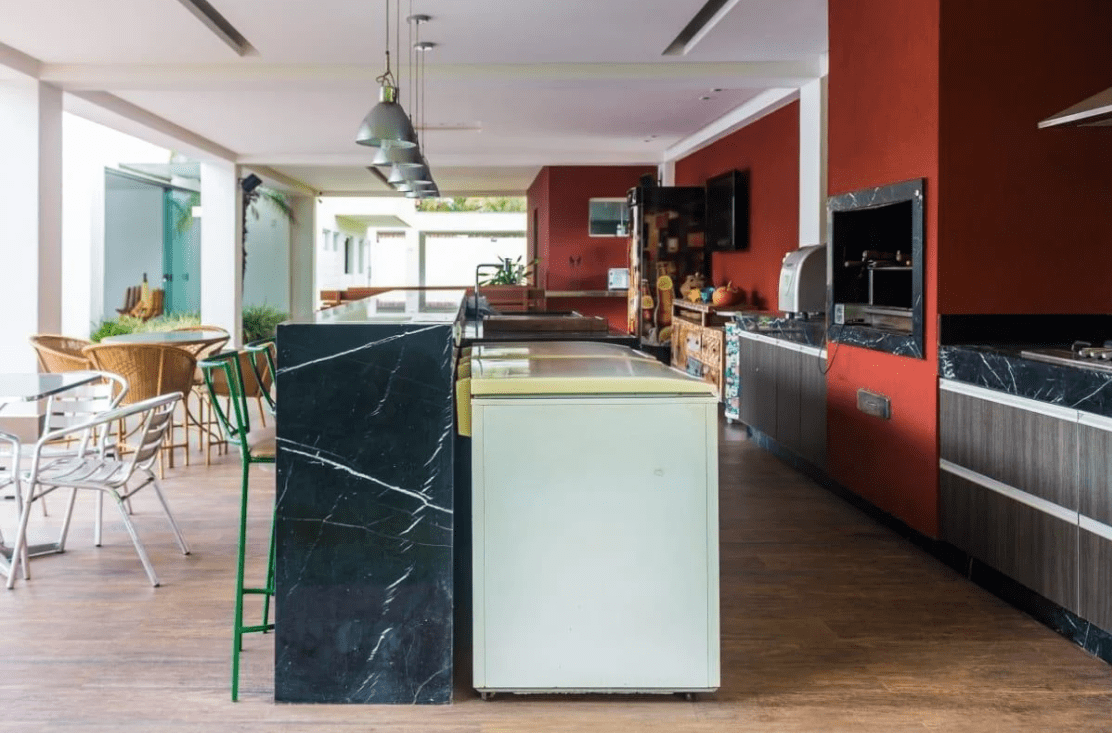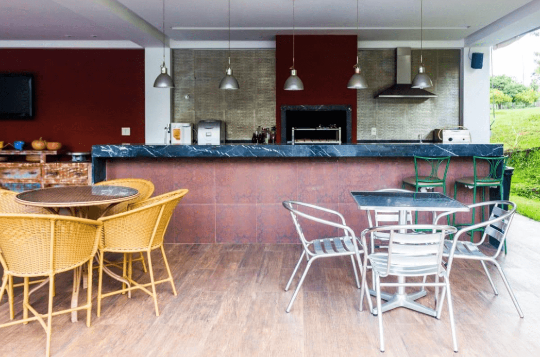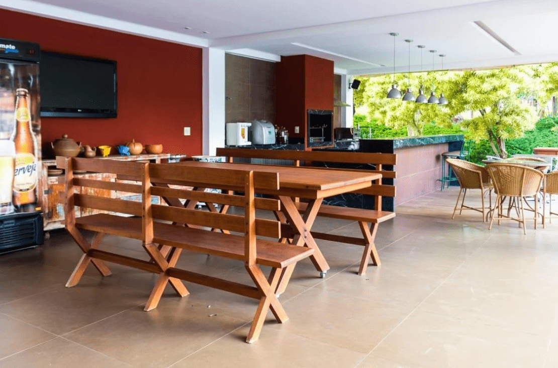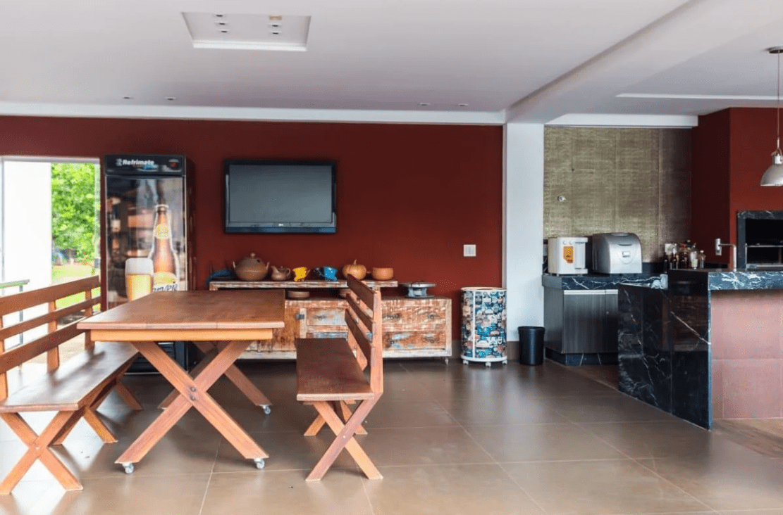 Fantástica área gourmet com churrasqueira, cooktop, banheiros, depósitos e estrutura independente;